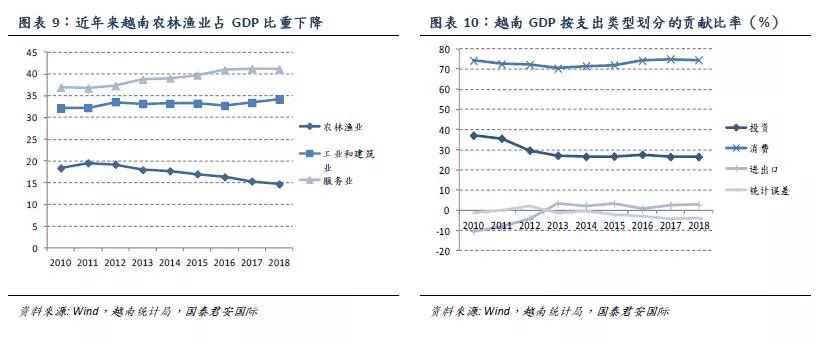 经济结构,随着对外经济政策的不断开放,越南实现了强劲的增长势头。2018年越南GDP总量达到2449亿美元,实际同比增速7.1%。2019年,越南经济保持强劲上升势态,上半年实际GDP增速达到6.8%,其中制造加工工业增长11.2%,服务业增长6.7%。从经济结构上看,若以支出类型划分GDP的话,2018年消费占GDP比重为74.0%,投资占比为26.5%,净出口则占比3.4%。按照行业来划分GDP,农林水产业对经济的贡献程度从2010年的18.4%下降到2018年的14.7%,工业和服务业对GDP的贡献率则分别为34.2%和41.1%。由此可见越南经济并不依赖于出口,工业和服务业是带动经济发展的重要引擎。