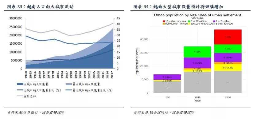 越南人口持续向大城市流动。从1990年开始,越南最大城市(胡志明市)人口占比变动不大,维持在25%左右,但(常住人口在100万以上的)大城市的人口数量占总人口比重持续拉升至17%,预计这一上升趋势仍将持续,人口将继续向大城市流动。目前越南人口密度为308人/平方千米,而河內市与胡志明市人口密度分別为平方公里2398人/平方千米和4363人/平方千米。世界银行预计越南在2030年将拥有一个1000万人口以上的超大城市、一个500-1000万人口的特大城市和一个100-500万人口的大城市。