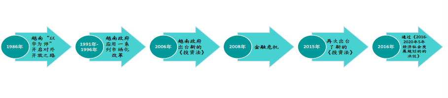 越南对外资开放更是促进越南经济增长,以下为重要的发展历程: