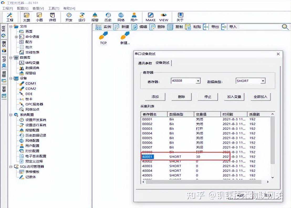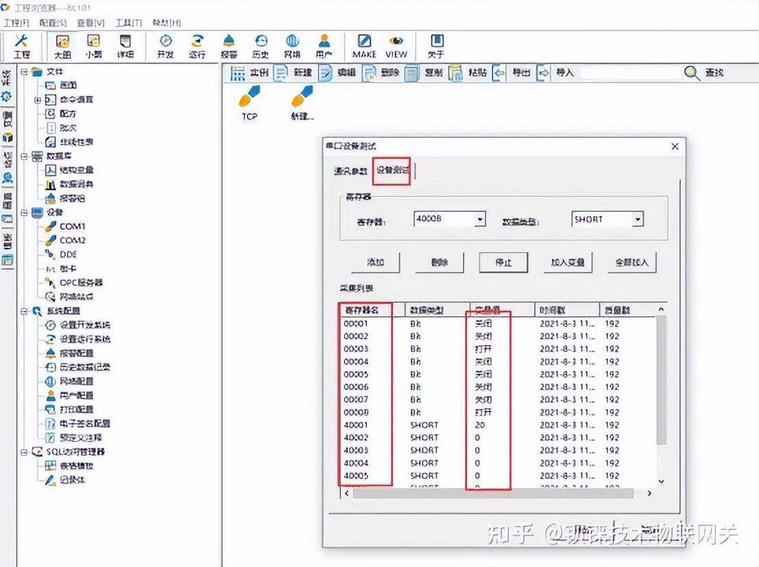 添加采集三菱PLCFX3U的数据点本示例采集三菱PLCFX3U的寄存器TS的部分数据配置如下: