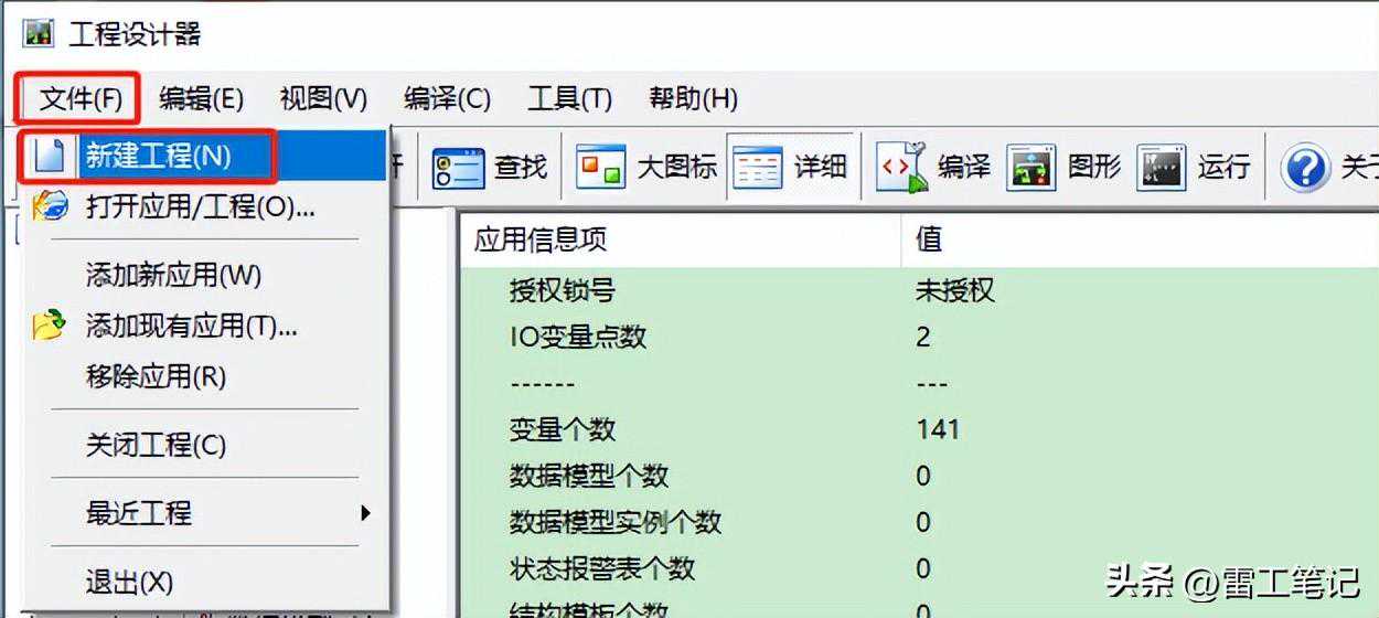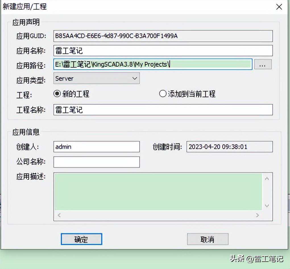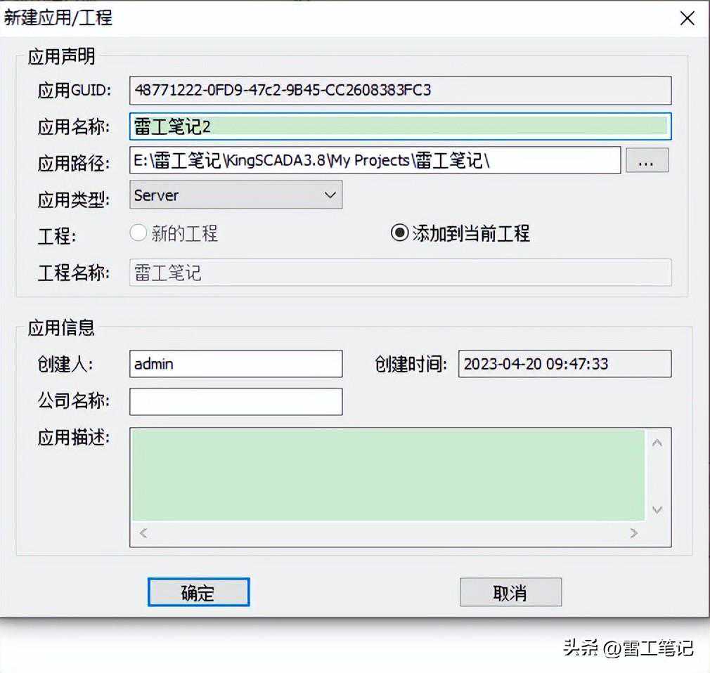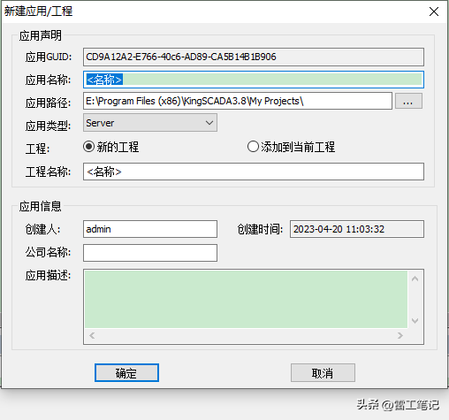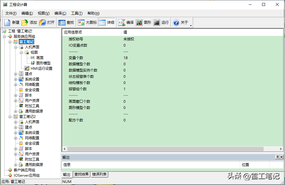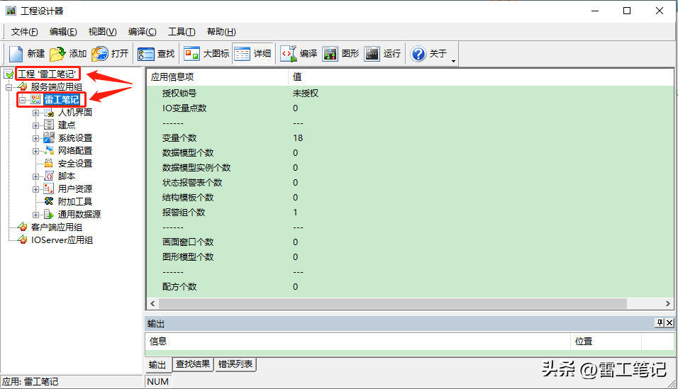 如下图所示,在工程设计器中新建了一个工程‘雷工笔记’,并在服务端应用组下面建立了一个服务端应用“雷工笔记”。