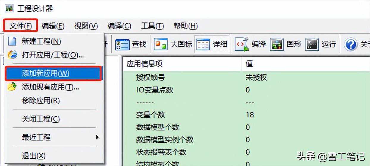 在工程设计器中,选择“文件”菜单→“添加新应用”命令: