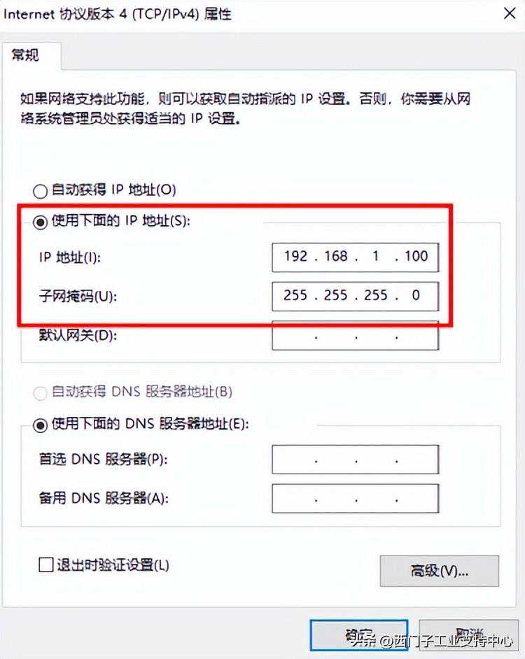 将PG/PC调试电脑的IP地址设为192.168.1.100,子网掩码为255.255.255.0: