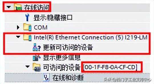 新建博途项目,在项目导航中选择“在线访问”中的调试电脑网卡,双击“更新可访问的设备”搜索连接的设备: