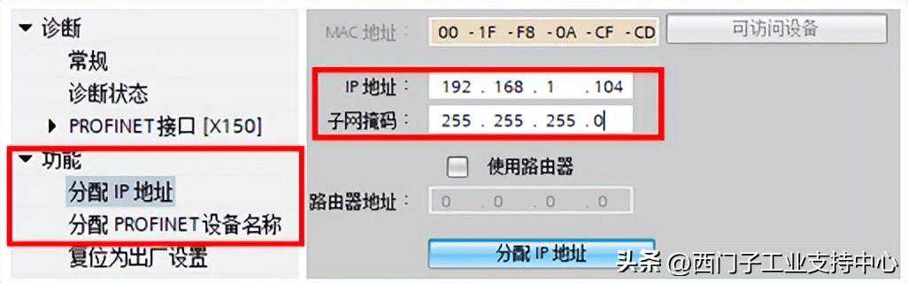双击搜索到的设备下的“在线和诊断”,在“功能”下分配S120的IP地址、子网掩码和设备名称:
