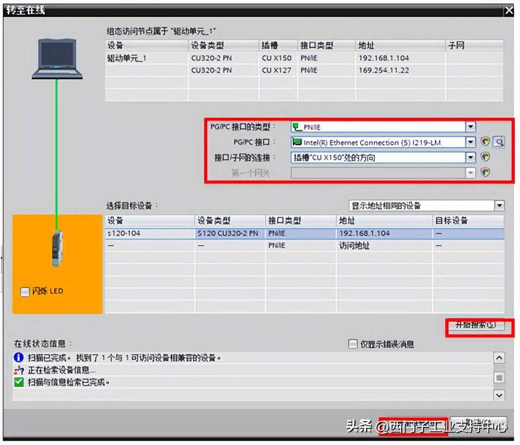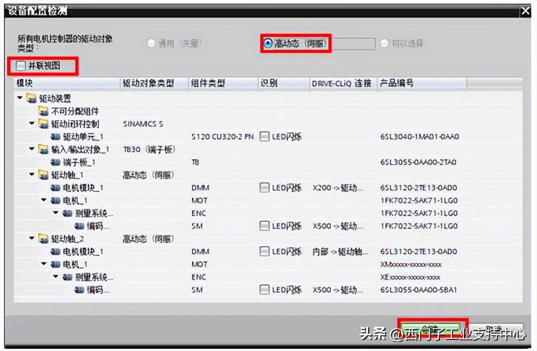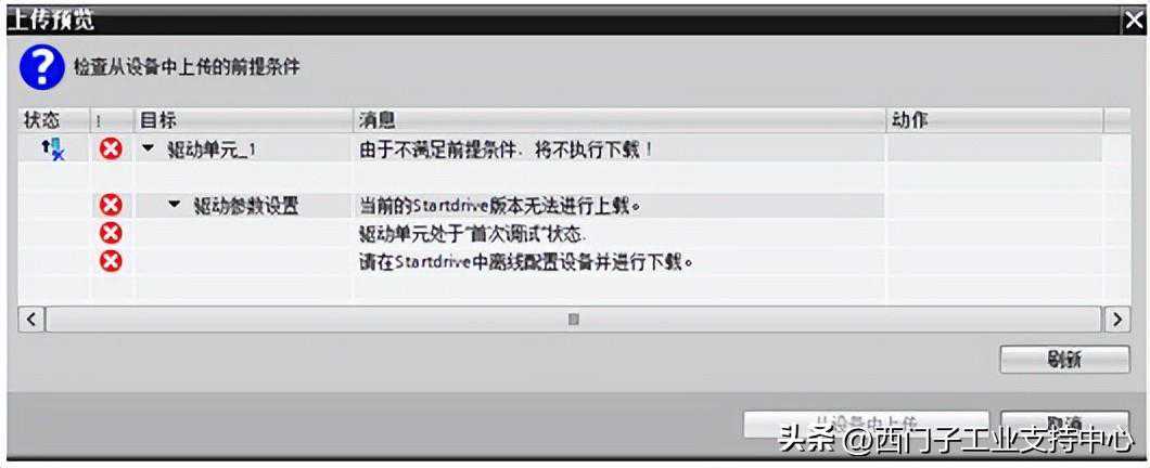 由于驱动单元处于“首次调试”状态,Startdrive无法进行上载,请按照步骤5操作