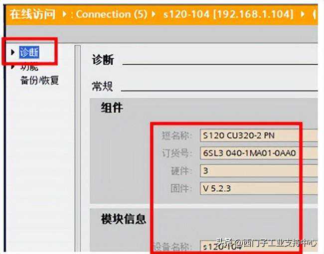在“在线和诊断”/“诊断”下,可以查看控制单元的基本信息,如控制单元的短名称为S120CU320-2PN,订货号为6SL3040-1MA01-0AA0,版本为,设备名称为s120-104: