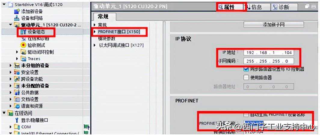 打开S120的设备组态,在属性窗口中设置S120设备的IP地址、子网掩码和设备名称,要与分配的保持一致: