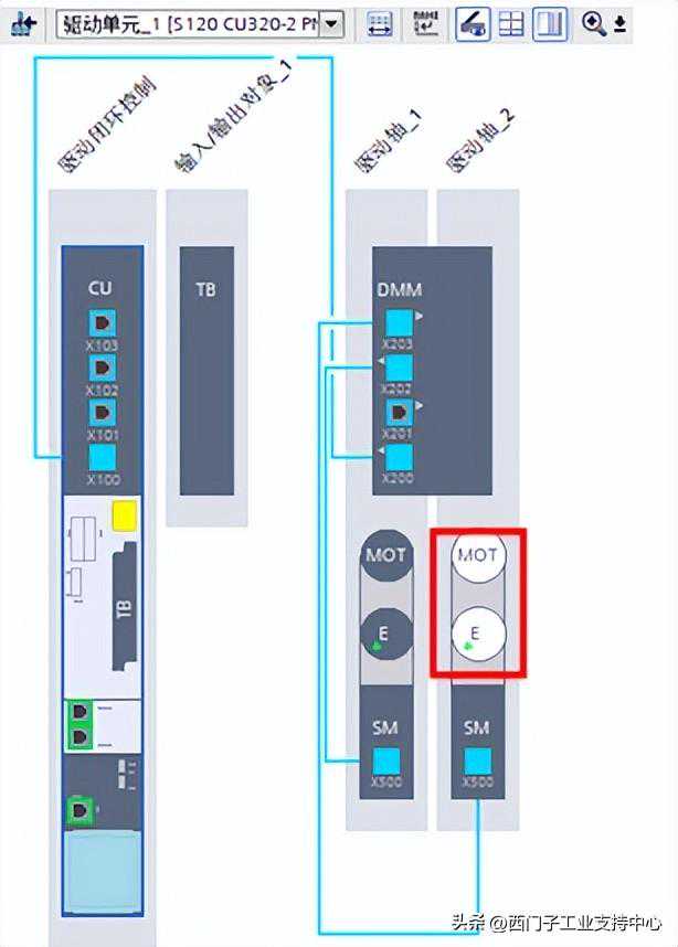 在设备视图中显示读取到的实际拓扑结构,如果有未分配的组件,需添加组件并修改拓扑图。由于电机2是非Drive-Cliq接口,所以需在拓扑图中对电机2组件进行指定:
