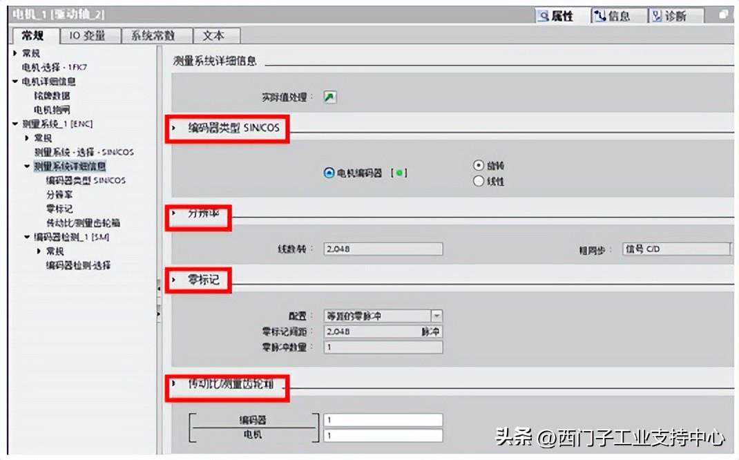 测量系统详细信息,包括编码器类型、分辨率、零标记和传动比/测量齿轮箱信息: