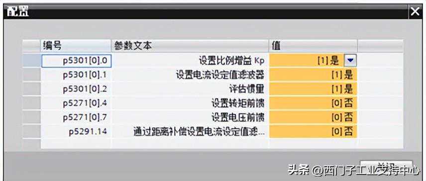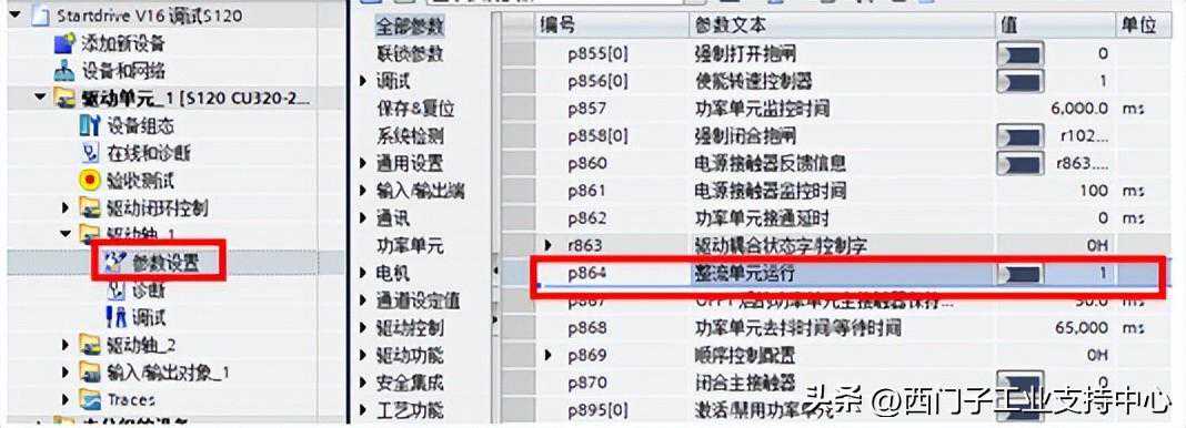 双击驱动轴下面的“参数设置”,可打开每个驱动轴的参数设置,在参数视图根据实际情况设置“电源运行”(p0864)的信号源,这里为1。