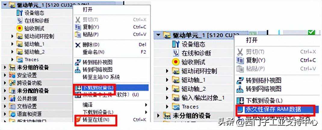 “永久性保存RAM数据”,保存项目,检查驱动状态,必要时“转至离线”,重启设备