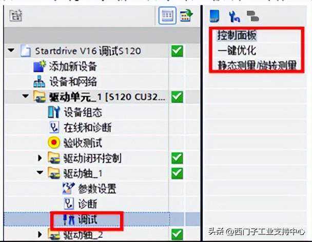 在线状态下,打开“驱动轴_1”的“调试”,步骤14~17为“静态测量/旋转测量”,步骤18为“一键优化”,步骤19为“控制面板”界面操作: