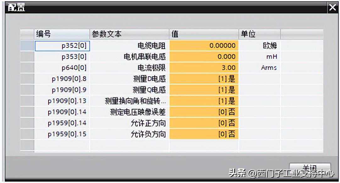 选择“静态测量”,配置P352电缆电阻、P353电机串联电感等参数: