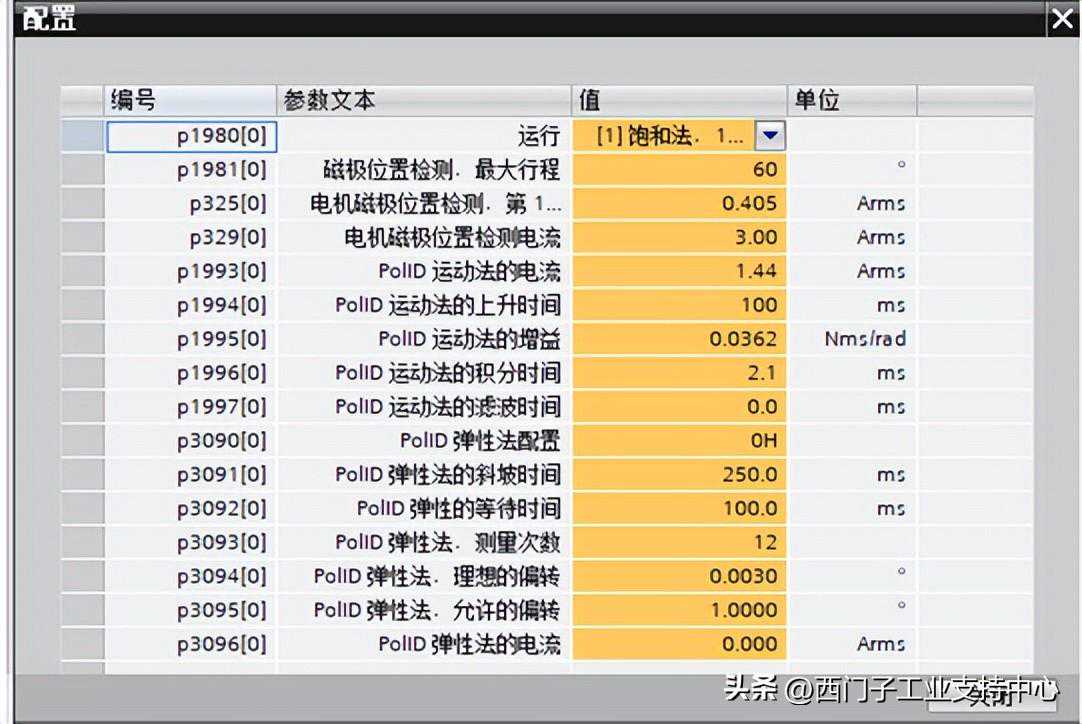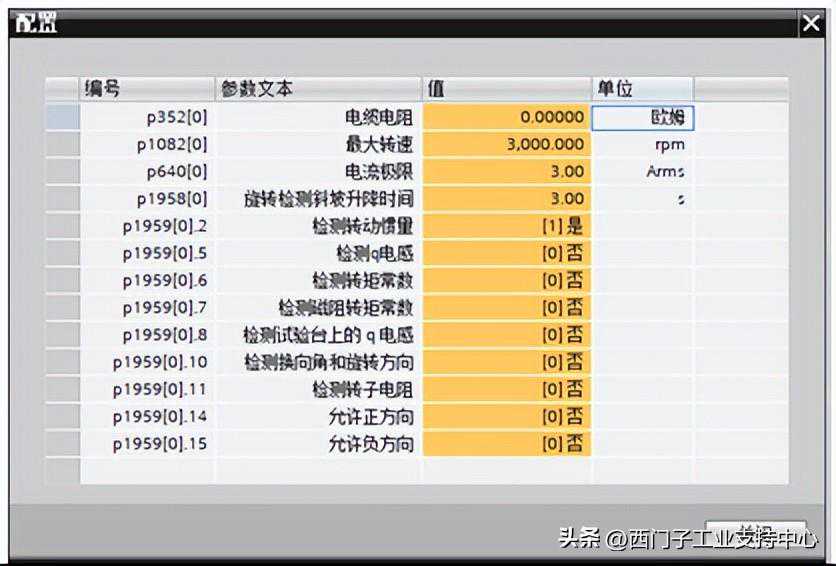 选择“旋转测量”,对于伺服电机,旋转测量很容易造成电流限幅、转速限幅等,需要在配置中修改P1958旋转检测斜坡升降时间和P1082最大转速,仅检测转动惯量:
