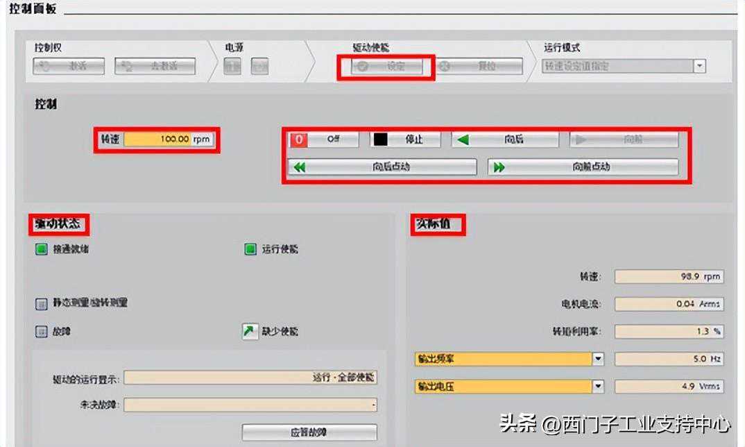 打开“控制面板”窗口,设定“驱动使能”,给定一定转速,通过向前和向后按键实现速度运行或点动运行,“off”按键停止,同时可查看驱动状态和实际值: