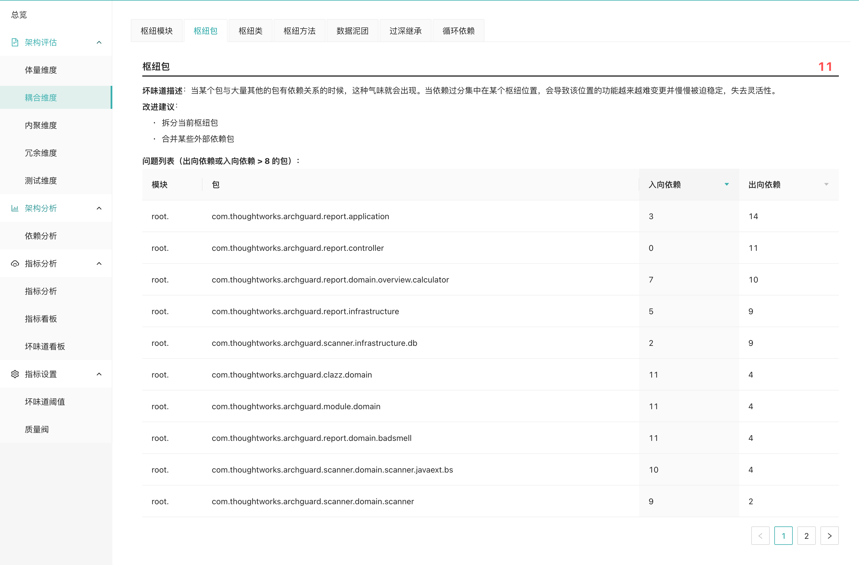 并通过体量维度、耦合维度、内聚维度、冗余维度、测试维度五大维度对架构进行评估,以及一系列的指标来分析系统的情况:
