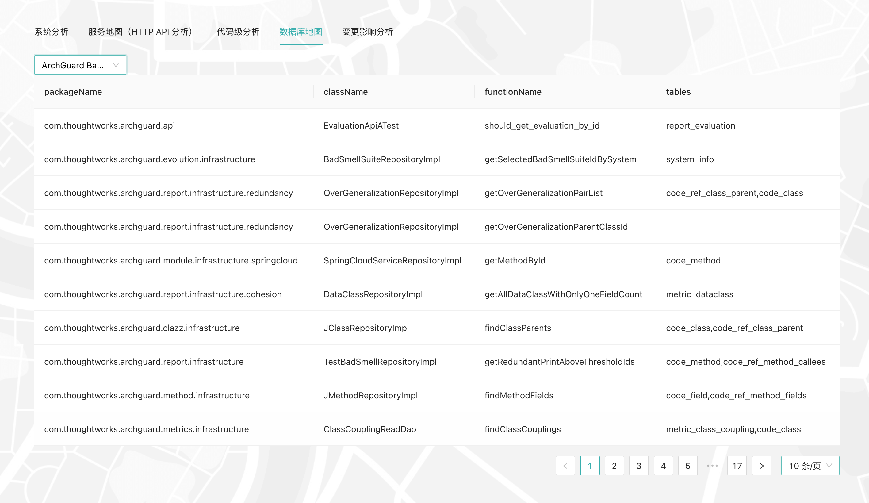 针对于数据库间的依赖问题,ArchGuard可以解析代码中的SQL调用,并尝试性将这种依赖关系与不同的微服务相匹配,进而分析哪些服务在数据库层是耦合的。由于存在不统一的编码规范,所以有些情况下,我们并没有识别出代码中的数据库表: