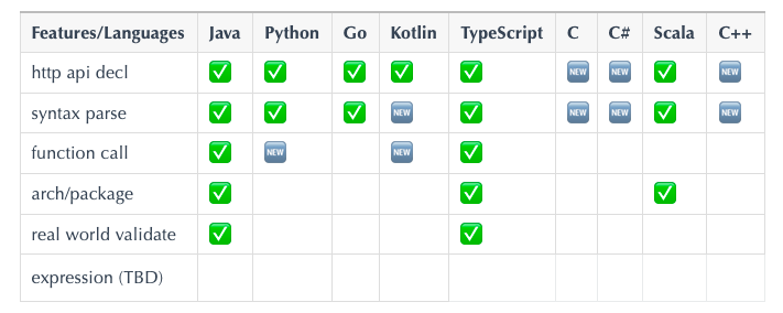 源码分析主要是静态分析,结合先前在重构自动化开源组织Modernizing下开源的Chapi代码分析引擎。Chapi基于Antlr实现的语法分析,支持主流的编程语言:TypeScript/JavaScript、Kotlin、Java、C#等等。如下表所示:
