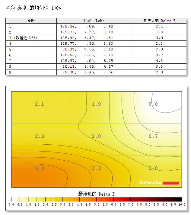 下面我们要进行的是,屏幕色彩、亮度均匀性测试,校色仪会在测试中测出每个区块不同百分比的亮度和色度坐标的最大差异值,从而得出这款显示器哪个部位的屏幕亮度均匀性更好。
