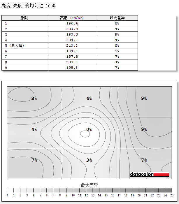 接下来测试的是屏幕的亮度均匀性,通过测试我们可以看出此款显示器的最大亮度区域在中间位置,屏幕的亮度均匀性最大差值为9%。