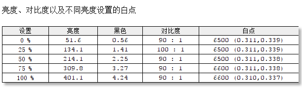 下面的测试为亮度、对比度以及不同亮度设置的白点,本测试项目主要测试显示器的色温。