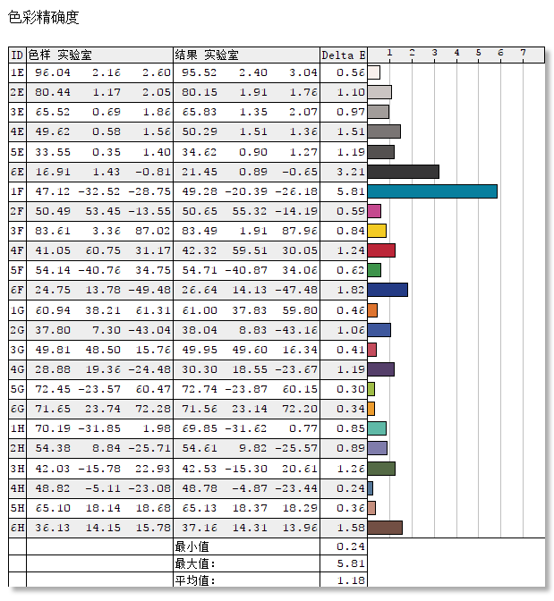 在色彩精准度方面,此款显示器最小值为0.24,最大值为5.81,平均值为1.18,成绩不错。
