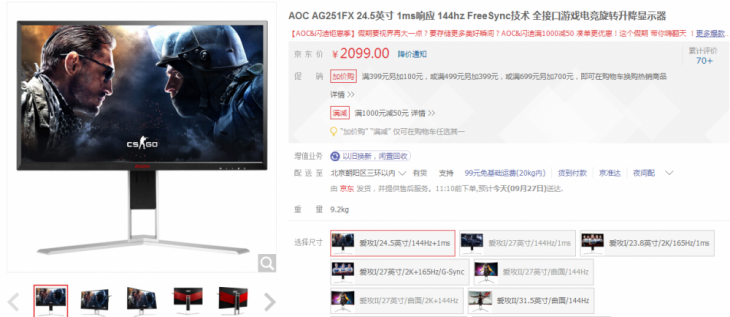 作为一款电竞显示器,24.5英寸TN屏+144Hz刷新率+1ms响应可以说是完美的组合,24.5英寸的尺寸是更适合电竞选手使用的显示屏幕,越大的尺寸反而会让眼睛的观察范围受到影响,而在色域方面,虽然此款产品采用TN屏,但各项测试结果与实际体验中都能看到,它得色域表现也非常出色,价格方面,现在京东仅售2099元,对于如此一款电竞显示器来说,绝对是非常良心了。■