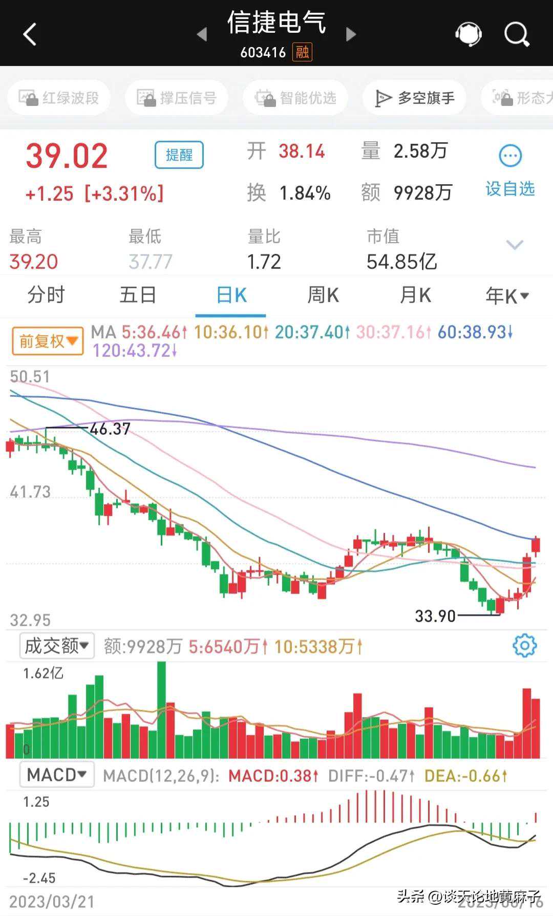 总结:信捷电气核心技术扎实,产品丰富,属当前机器人产业链,市值54.85亿元,MACD金叉已成,放量上涨,坚定做多该股,目前股价看至47元左右。