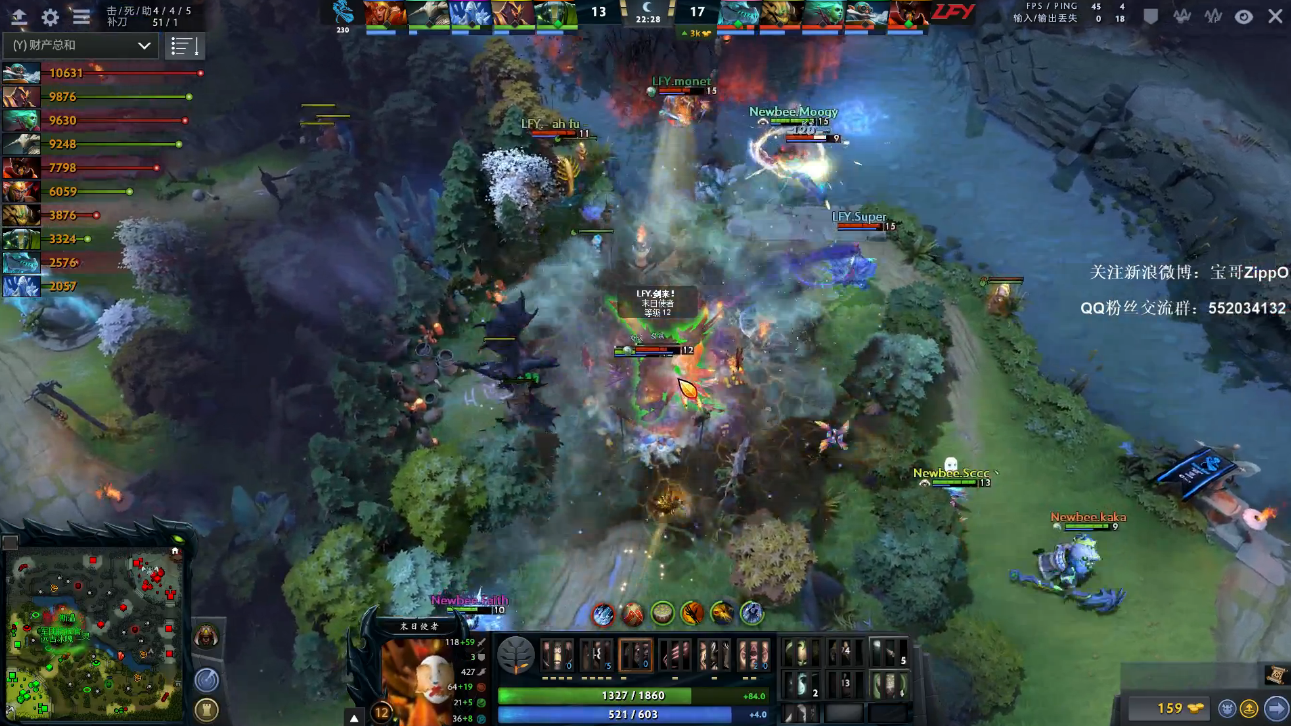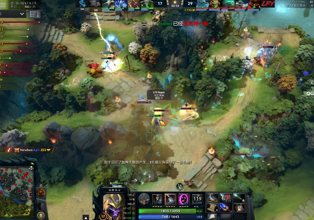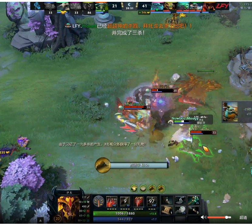 33分钟,LFY打出奠定胜势的一波团战,军团先手末日,又被对面开出BKB。加上冰龙莲花在手,沉默大招已经没有之前那么厉害。阵形被冲散的NB被打出一波团灭,并且中路高地被破。