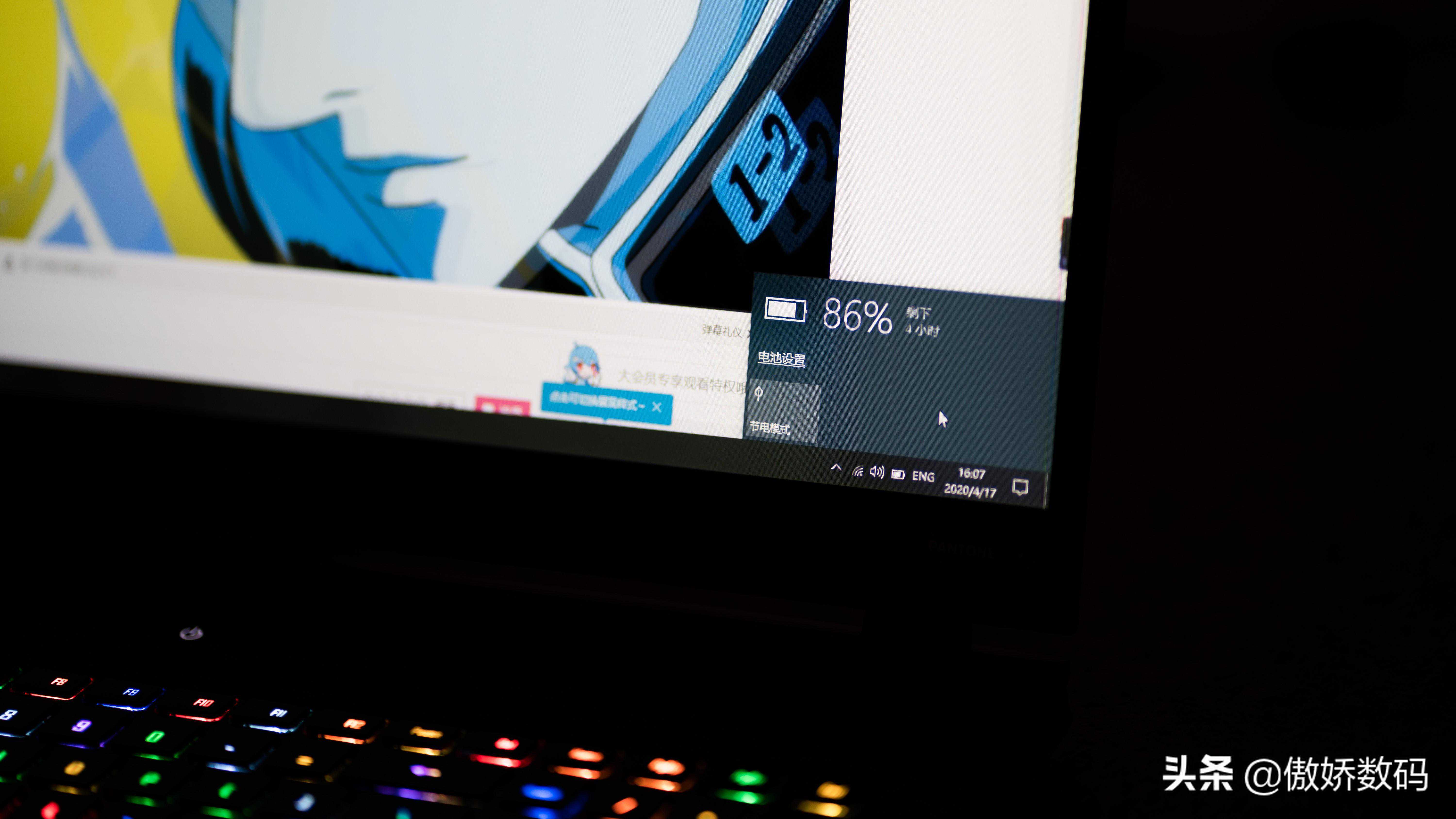 虽然接近3.5kg的旅行重量让傲娇君没有太多想带他出门浪的想法,但如果实在有带出去使用的需要,90Wh级别的电池容量也还是很nice的,把亮度调到40%,可以在B站看4个多小时的逼王坂本,如果只是单纯office办公的话,应该可以做到6-7小时级别的续航,极限情况下不带电源出去应该也能撑满1天的使用