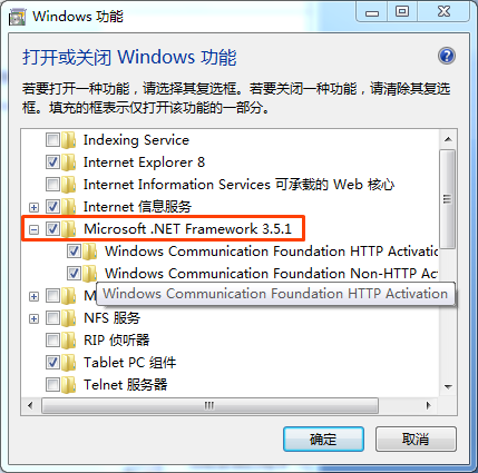 控制面板——程序和功能——打开关闭windows功能——把有.NetFramework项的子项都选择——确定