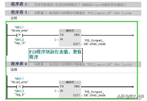 在程序块PID_Compact内,管角Error=1时,指示当前PID运行状态出错。要重新启动PID功能,需要改PID模式。来恢复PID运行,在复位PID之前,需要确认错误已经消除。其他方法无法重新启动PID,包括Reset功能也不能重置。