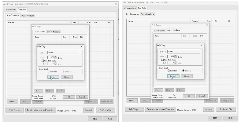 5.双击PLC节点,在Tag设置中增加输入输出节点,注意起始地址和数据长度。