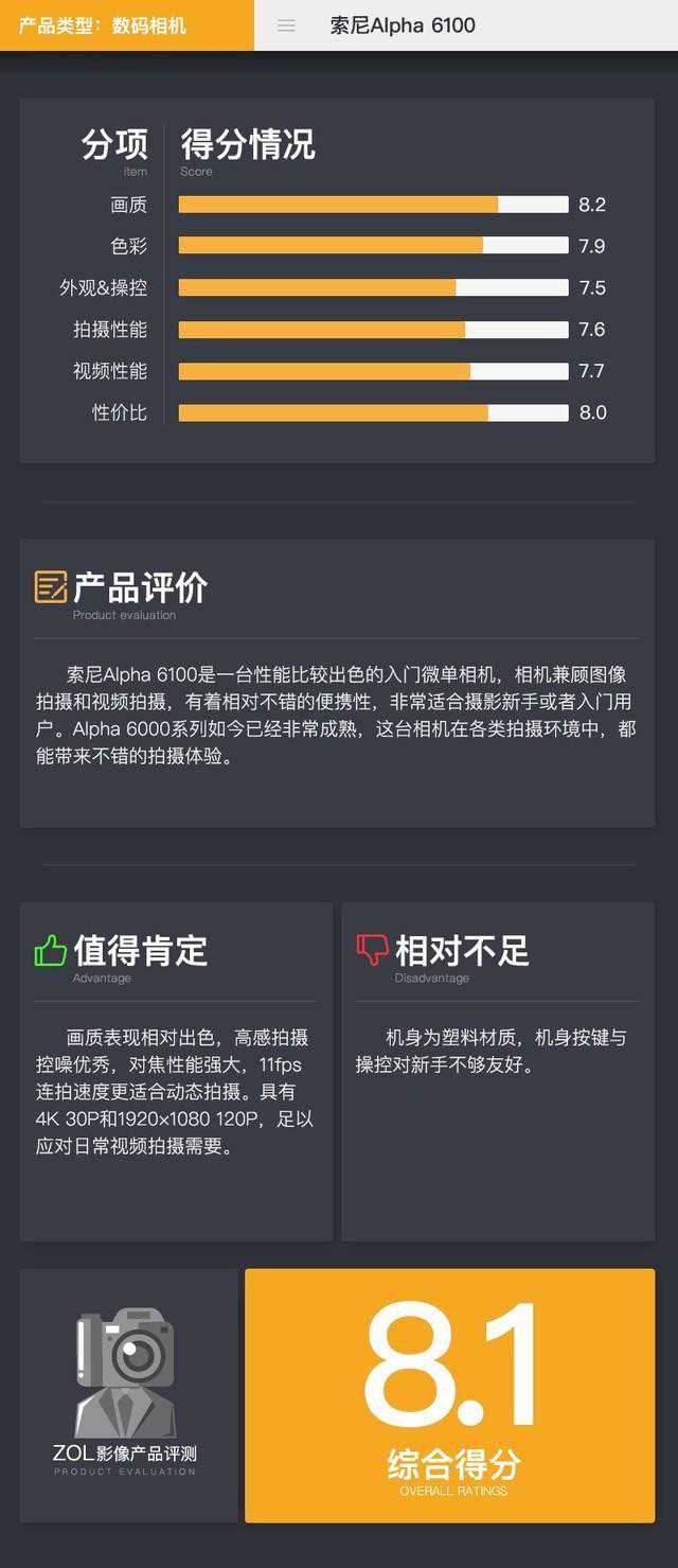 对于这台相机,我给出8.1的得分。相机轻巧便携、性价比、画质出众是相机的优点,但是对于这个级别相机来说,索尼的操控逻辑不够合理,而且对焦稳定性不如Alpha6400。