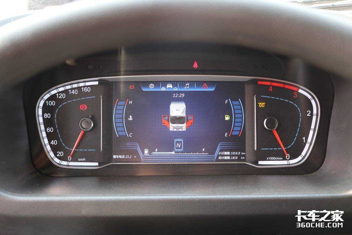 仪表盘采用了大面积液晶屏设计,和福田此前推出的高端轻卡金奥铃上的仪表盘一样,中间区域支持车辆电压显示、车门未关提醒、当前挡位、保养信息以及瞬间时速等功能,能够及时提醒女卡友车辆状态和保养时间,十分细心。