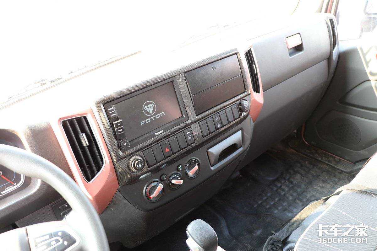 中控区域的设计和传统奥铃比较接近,但是在空调调节旋钮以及面板上都加入了粉红色元素,看上去十分新潮。同时中控大屏为福田原厂提供,支持360环绕影像、手机互联、导航以及APP的使用,日常驾驶中操作也比较简单。