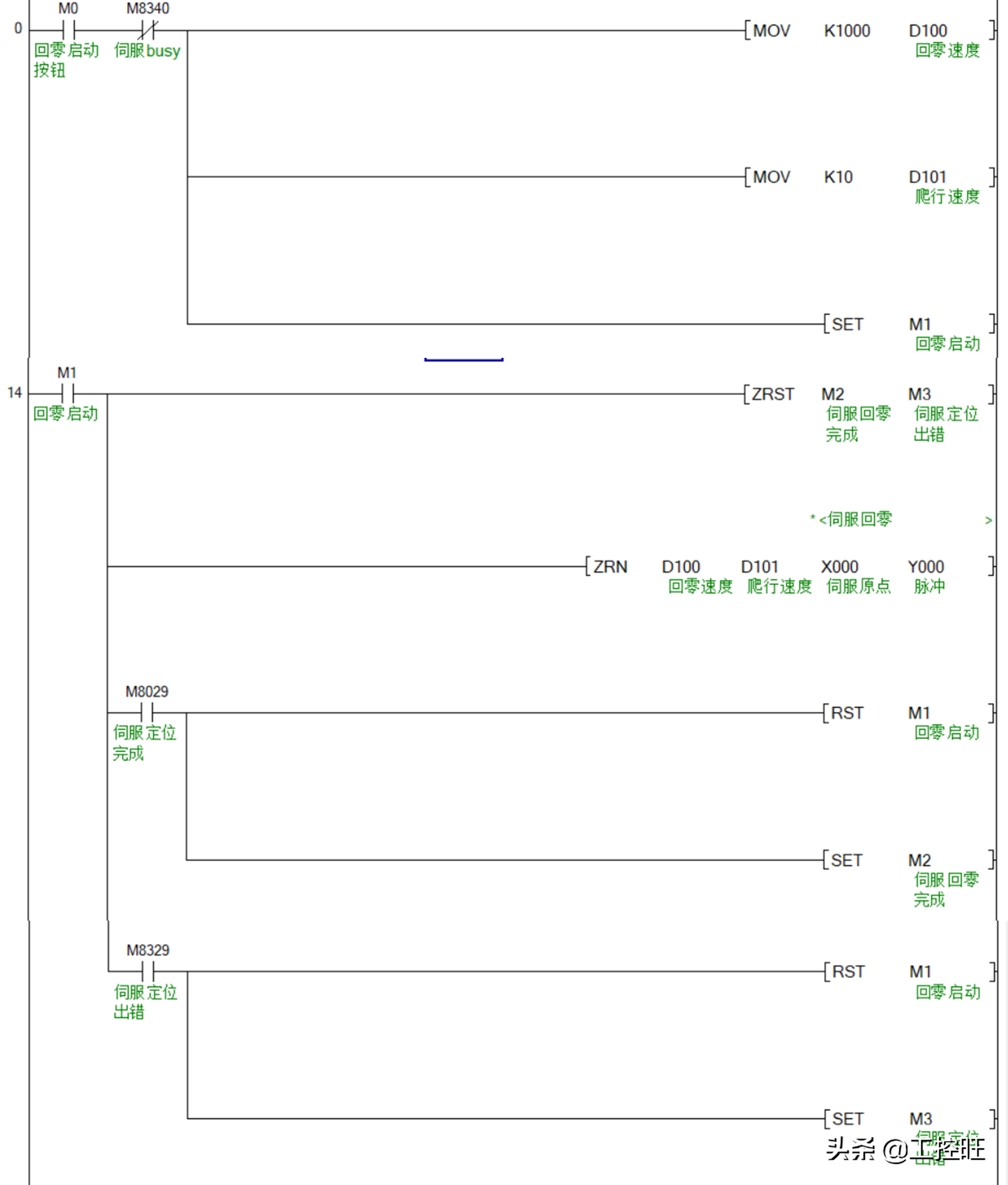 ZRN指令的说明:ZRNS1S2S3D;S1伺服回零时的速度,S2爬行速度,也就是伺服碰到近点感应器(也即原点感应器)时,在原点感应器ON期间的速度,S3为指定的近点感应器的的编号(为位寄存器),D为PLC的脉冲输出端,通常为Y0,Y1等高速脉冲输出口;
