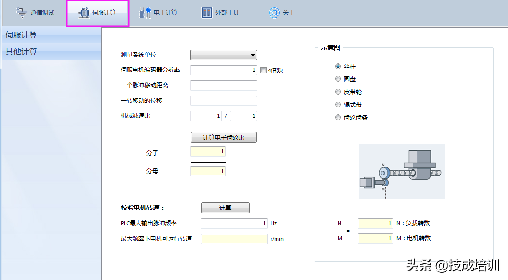 伺服计算工具主要用于计算电子齿轮比和脉冲与工程单位的换算,分别选择jcTool工具箱中的"伺服计算"和"其他计算"可进入对应使用界面。