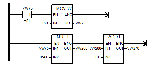 图3为人机界面TD200由地址VW75向CPU224传送频率数量值,数值范围为0~50,经SIMATIC整数数学运算指令,产生0~32000的数字量,这相对于变频器模拟频率0-50HZ,由图2方式传送到输出模块模拟通道AQW0,形成0~10VDC电压作为变频器频率的给定值。