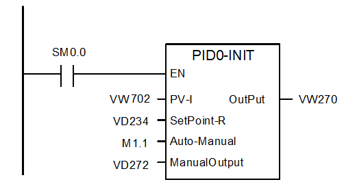 图4中,当=0时,变频器调频为手动,PID将进行手动相应计算,由PID外部参数ManualOutput作为设定值,ManualOutput数值范围为0.0-1.0之间的一个实数,代表输出范围的百分比,如VD272输入0.5,则VW270输出一个满值范围内的50%到图2中AQW0。