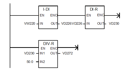 PID外部参数的设定经SIMATIC数学运算、传送指令(如图5、图6)求得。其中:VD24为设定出口水压力地址;VD66为出口水压力上限地址;AIW2为实际出口水压力地址;VW220为设定频率值地址。
