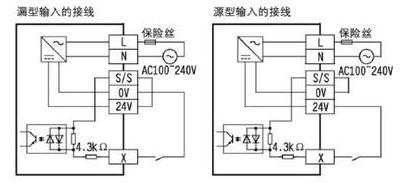 漏型输入即S/S接PLC供出电源24V,0V通过无源开关到输入接口X;或者NPN型传感器的信号线直接接入输入接口X;
