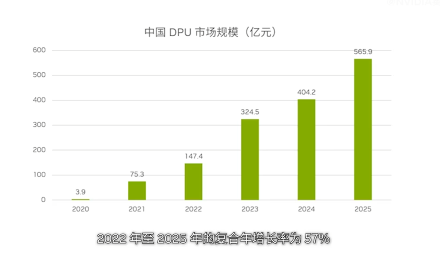 英伟达还额外援引了赛迪顾问提出的预测数据,据悉,到2025年中国DPU市场规模将达到565.9亿元人民币,2022年至2025年的复合年增长率为57%,因此“DPU具有客观的市场前景”。