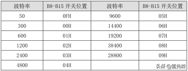 开关1/3的高8位表示通讯所用波特率,用16进制表示,对应关系如下: