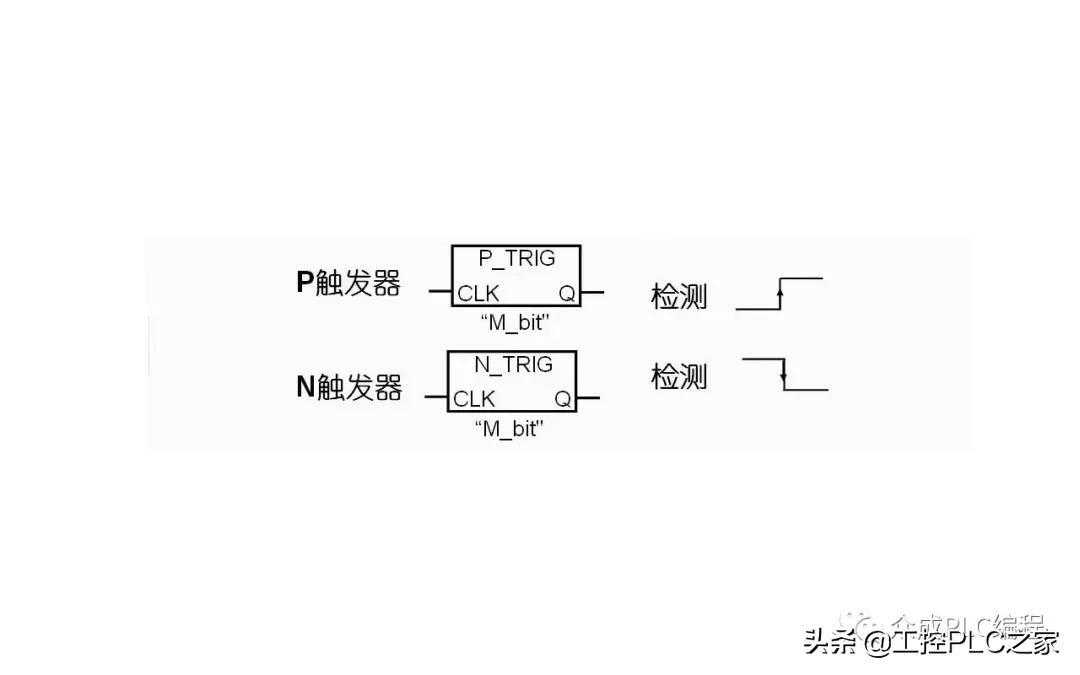 P触发器、N触发器指令如图所示,其中M_bit处为BOOL型变量,用于保存前一个输入状态的存储器位。当P触发器指令检测到CLK输入的逻辑状态由0变1的正跳变时,在一个扫描周期内Q输出为1;当N触发器指令检测到CLK输入的逻辑状态由1变0的负跳变时,在一个扫描周期内Q输出为1。