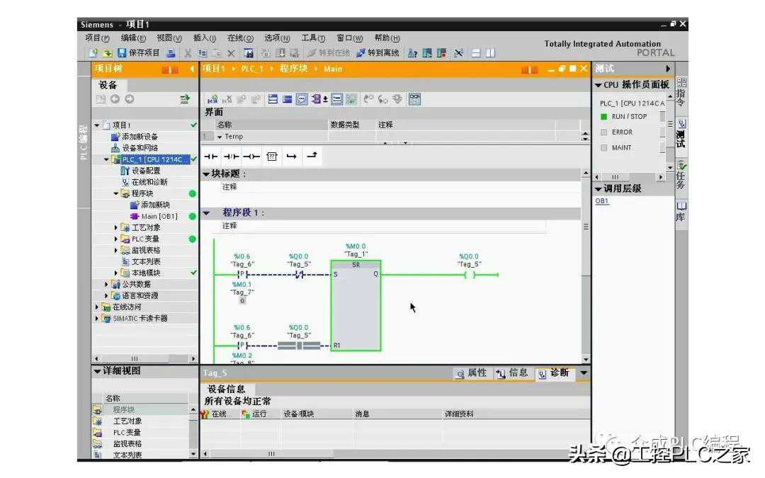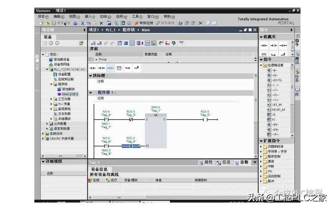 一、编写程序。首先在项目树中打开PLC下面的程序块文件夹,双击MAIN打开程序编辑器,在项目视图右侧的指令中,打开位逻辑运算文件夹选择SR指令,双击或拖放到编程区域,输入地址,用于存储置位或复位的结果,编辑器自动为生成了变量名称TAG_1,可以在PLC变量表中修改,在Q输出端插入一个输出线圈,输入地址,在S输入端插入一个P触点,输入地址和,用来捕捉被按下时的正跳变,再串联一个的常闭触点,用于实现为0时按一下,置位为1,同样在R1输入端插入一个P触点,输入地址和,再串联一个的常开触点,以实现为1时按下,复位为0,这样控制程序就编写完成了,单击保存项目按钮保存项目。