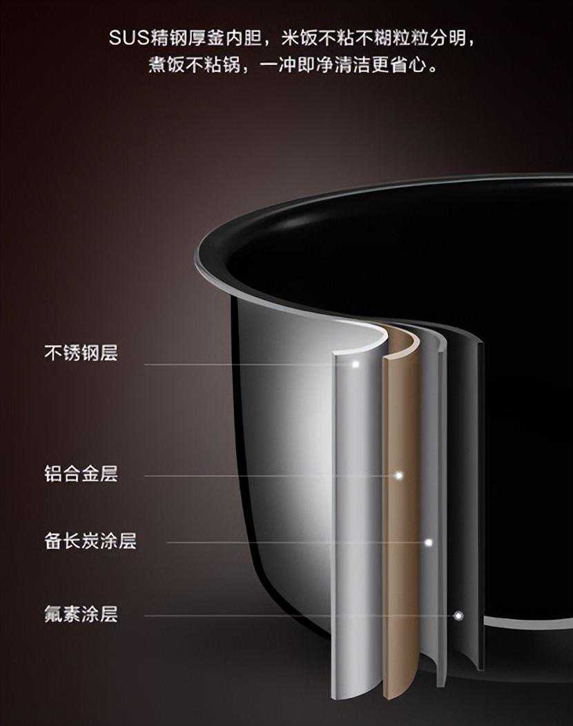 相比之下,松下真香煲的内胆就要薄很多,采用SUS精钢厚釜,4层复合材料仅厚2mm,更轻便省力,备长炭涂层让煮饭不粘锅,清洗起来更方便轻松。但内胆材质要逊色一些,虽也是食品级材质,但相比Peek涂层,耐磨性和抗菌率方面要差一些,对于没有特别要求的家倒是够用的。
