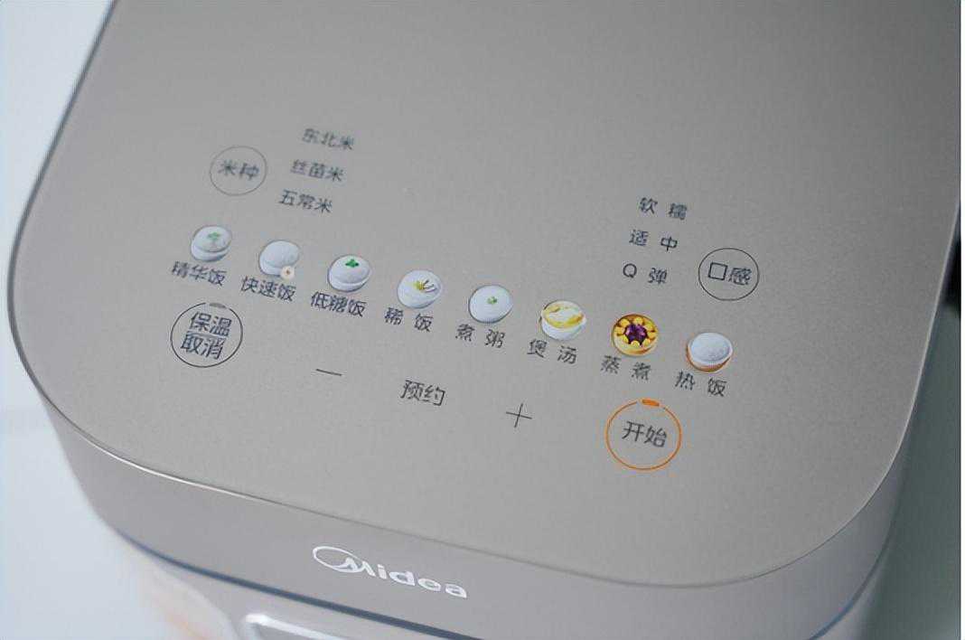 美的小赤炎电饭煲以雅士金覆盖全机身,整体是金属质感,科技感。现代感十足,属于目前年轻人钟爱的风格。面板是一整块纯平玻璃,不仅美观耐磨,清洁也更方便,污垢油渍一抹即净;按键面与很多品牌不同,是彩色带图画的,虽然指示更清楚,但总觉与淡金机身稍有违和,统一色调可能更有格调。