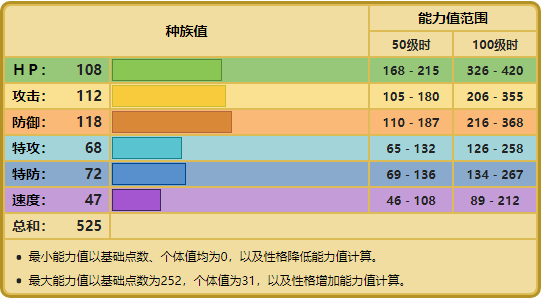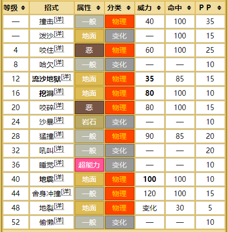 注:技能参照第八世代游戏技能表。技能里粗体字的招式为具有属性一致加成效果的招式。招式教学是可以通过招式教学习得。PP则是使用技能次数。